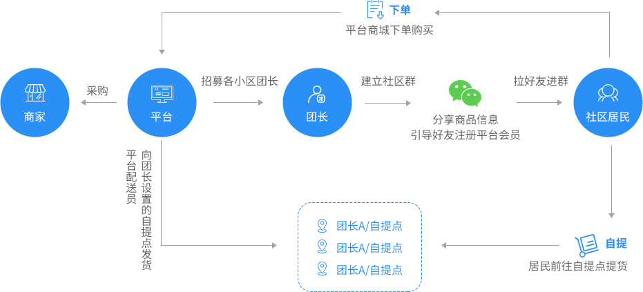 平台以社区为节点,全面打通线上线下,团长线上推广、线下交付的点对点卖货模式。